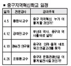 - "살맛나는 원도심 함께 만들어요" ( 366호 ) 중구지역혁신학교 개설 4월 매주 목요일 오후 4시 우리구는 살맛나는 원도심을 만들기 위해 4월 매주 목요일마다 `중구지역혁신학교'를 연다. 원도심이 살아야 부산이 산다는 주제로 중구 지역혁신협의회가 개설한 중구지역혁신학교는 혁신마인드 정립과 고부가가치 지식창출을 위한 열린 학습의 장이다. 중구지역혁신학교는 우리구 지하대회의실에서 열리며 지역주민과 협의회 위원, 공무원 등 150여명이 참석할 것으로 보인다. 오는 4월 5일 첫 강좌는 `중구 지역혁신, 누가 어떻게 할 것인가?' 라는 주제로 부산대학교 경제학과 황한식 교수가 강사로 나선다. 12일 열리는 둘째 강좌는 경성대학교 인문학부 강대민 교수가 `부산의 역사, 중구의 역사를 바로 알자!'라는 주제로 강의를 한다. 19일에는 사)동남경제연구원의 정승진 연구원이 `중구의 인적·물적 네트워크 연결고리를 찾자'를, 26일에는 동아대학교 국제관광학부 조명환 교수가 `중구의 문화관광산업 어떻게 발전시킬 것인가'를 주제로 강의를 선보인다. ※문의:기획감사실 600-4161∼2